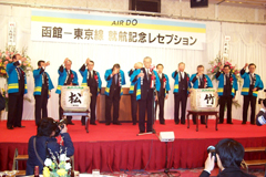 3月17日、函館線就航を翌日に控えた北海道国際航空(株)(エア・ドゥ、札幌市中央区本社、滝澤進代表取締役社長)は、ホテル函館ロイヤルで記念レセプションを開催した。出席者は函館地域の経済関係者や行政関係者約230人。市議会の日程をおして井上博司函館市長も列席し、函館地域の就航に対する期待の大きさを窺わせた。